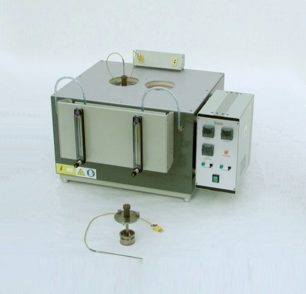 High temperature evaporation loss - ASTM D2595The apparatus, in acc. with ASTM D 2595, consists of a case hosting the aluminium block and supporting precision flowmeters. The block has jackets for the introduction of the cups: the air preheater is in the bottom. Each position is equipped with a digital display, connected to a thermocouple, that continuously shows the temperature of the air coming out from the cell.