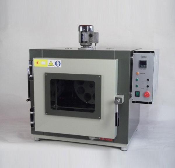 Rolling thin film oven test of bitumens RTFOT - ASTM D2872The apparatus, in acc. with ASTM D 2872 - EN 12607, consists of a forced air circulation oven suitable for temperatures up to 180°C and equipped with a rotating shelf placed inside along with a coil that preheats the air directed into the sample container.